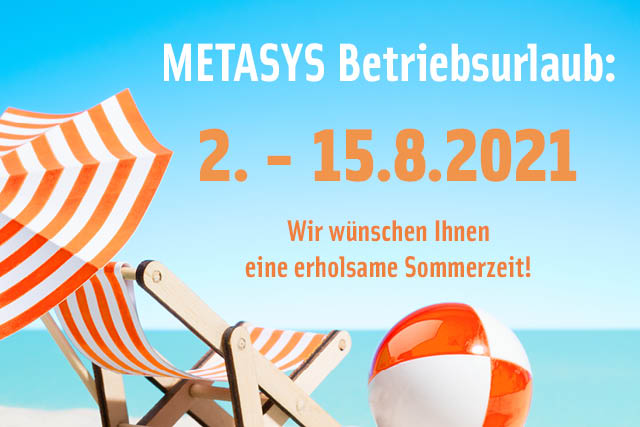 Aufgrund unserer Betriebsferien bleiben die METASYS Büros vom 2. bis 15. August 2021 geschlossen. Ab dem 16. August 2021 sind wir gerne wieder für Sie da.
